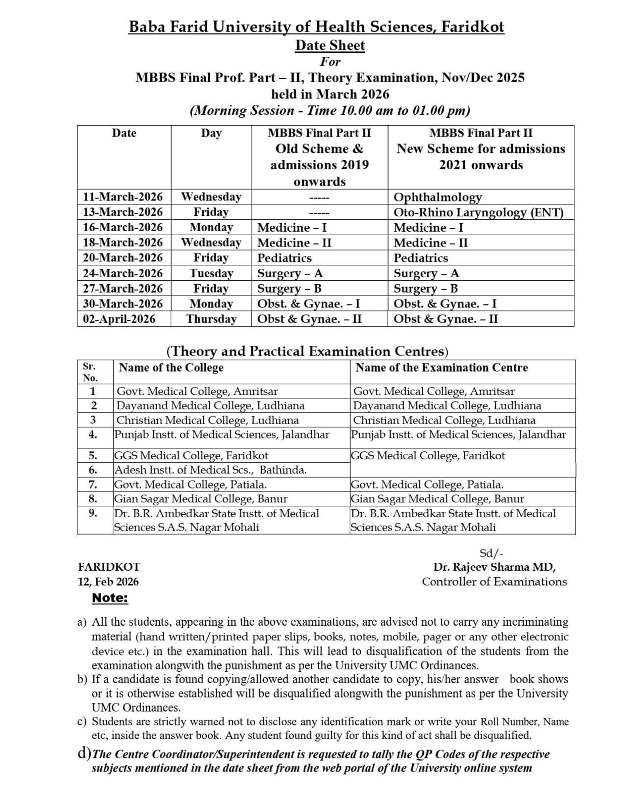 Date Sheet | BFUHS Theory Examinations – MBBS Final Prof Part-II